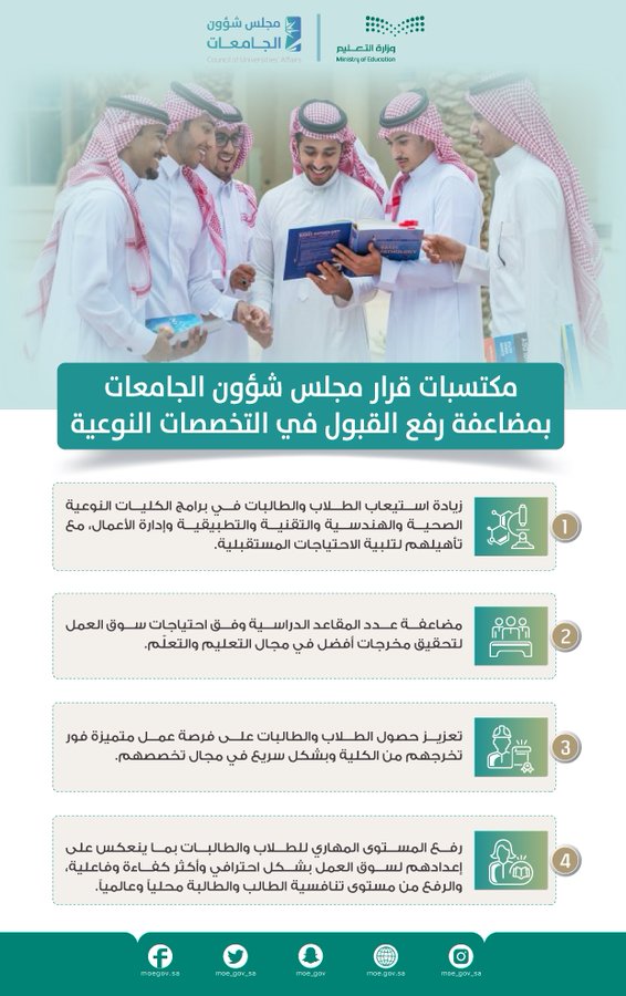 وتضمَّنت قرارات مجلس شؤون الجامعات،رفع القبول إلى ضِعْفِ ما كان عليه عام 2020م في الكليات النوعية (الصحية والهندسية والتقنية والتطبيقية وإدارة الأعمال) وفقاً للطاقة الاستيعابية لتلك الكليات، وبما يحسِّن من مخرجات العملية التعليمية، ويسهم في سد احتياجات سوق العمل، وتخفيض القبول بنسبة لا تقل عن (50%)، في التخصصات غير المتوائِمة مع سوق العمل مع زيادة استيعاب الطلاب والطالبات في الكليات النوعية،على أن يعمل بهذا القرار لمدة خمس سنوات، ويتم تقييم تطبيقه بعد مرور ثلاث سنوات،وتقوم اللجنة الإشرافية برئاسة معالي النائب للجامعات والبحث والابتكار بمتابعة تنفيذ القرار.
