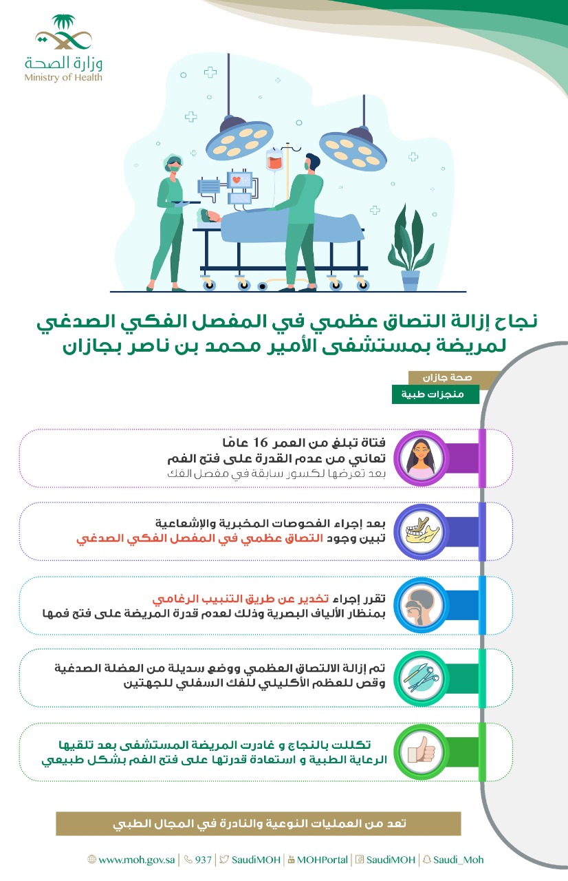 قالت صحة جازان بأن فريقاً طبي بمستشفى الأمير محمد بن ناصر تمكن من إنهاء معاناة فتاة في العقد الثاني من العمر كانت تعاني من عدم القدرة على فتح الفم.