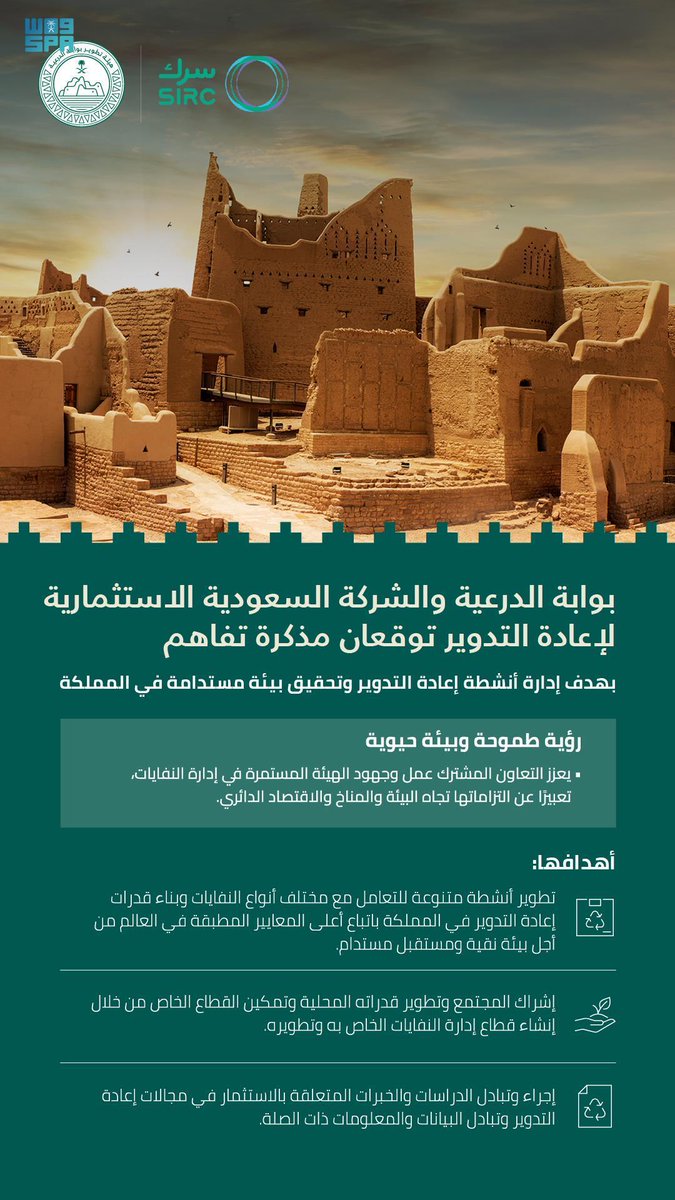وقعت هيئة تطوير بوابة الدرعية مذكرة تفاهم مع الشركة السعودية الاستثمارية لإعادة التدوير “سرك” بهدف التعاون في مجال معالجة المخلفات بكافة عناصرها التي تقع ضمن نطاق أعمال الهيئة، بما في ذلك الأبحاث والفرص الاستثمارية والتنفيذ والتشغيل والإدارة, حيث وقع المذكرة الرئيس التنفيذي في هيئة تطوير بوابة الدرعية جيري إنزيريلو والرئيس التنفيذي لشركة “سرك” المهندس زياد بن محمد الشيحة.