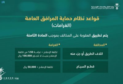 وأوضحت الوزارة أنَّ هذه التعدياتِ تسهمُ في الضَّرَرِ على مستخدمي الطريق؛ ولها مخالفاتٌ معتمدةٌ تُطبَّقُ على مرتكبها؛ ومن ضمنها مخالفة قطع السياج التي يُعاقبُ مرتكبُها بتكلفة الإصلاح بالإضافةلـ50 ألف ريال؛ وأيضاً إتلاف الطريق أو جزء منه؛وتقدر غرامة ذلك بتكلفة الإصلاح بالاضافة لـ50% من تكلفة الإصلاح على ألا تتجاوز 100 ألف ريالٍ؛ ودَعَتِ الوزارةُ الجميعَ برفع بلاغ عبر تطبيق 938 عند ملاحظة أي تعدٍّ على الطريق.