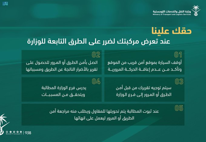 وأكدَتْ وزارةُ النقل والخِدْمَاتِ اللوجستية أنَّ لمستخدم الطريق حقًّا من خلال حفظ حقوقه في حال تَضَرَّرَتْ مركبتُهُ من الطريق؛وذلك عبر اتباع عدد من الخطوات التي تكفلُ لمستخدم الطريق حَقَّهُ؛حيث أَوْضَحَتْ الوزارةُ أنَّ الخطوةَ الأولى تكمنُ في إيقاف السيارة بموقع آمن قريب من موقع الضَّرَرِ مع أهمية التأكيد على عدم إعاقة الحركة المرورية، والاتصال على أمن الطرق أو الإدارة العامة للمرور حسب موقع الضَّرَرِ، للحصول على تقرير بالأضرار الناتجة عن الطريق ومسبِّباته، على أن يُرسلَ التقريرُ بعد ذلك من أمن الطرق أو الإدارة العامة للمرور إلى فرع وزارة النقل والخِدْمَاتِ اللوجستية في المنطقة، فيما يقومُ بعد ذلك فرعُ الوزارة بدراسة المطالبة والتحقُّقِ من المسببات، وعند ثبوت المطالبة يجري تحويلها للمقاول ويُطْلَبُ منه مراجعةُ أمن الطرق أو الإدارة العامة للمرور ليعمل على إنهائها.