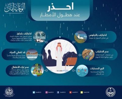 وأهاب المتحدث الرسمي للمديرية العقيد محمد الحمادي، بتوخّي الحيطة والحذر من المخاطر المحتملة في مثل هذه الأجواء، والابتعاد عن أماكن تجمع السيول، والالتزام بتعليمات الدفاع المدني المعلنة عبر وسائل الإعلام المختلفة ومواقع التواصل الاجتماعي، حفاظاً على سلامتهم.