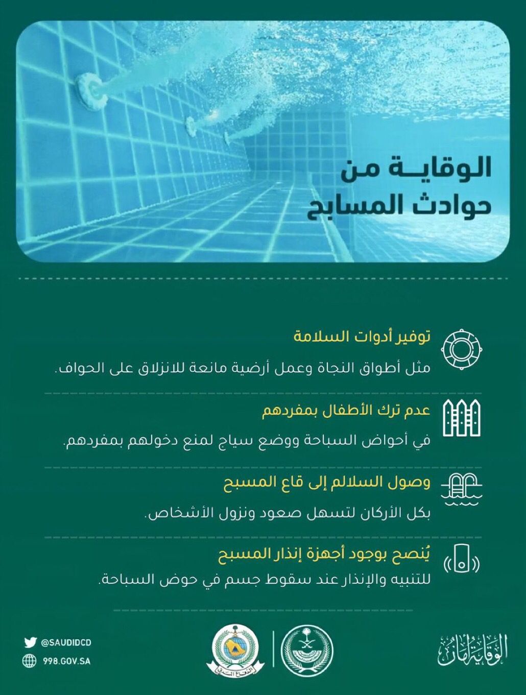لسلامة أطفالك أثناء السباحة دائما ما ينبه الدفاع المدني على اتباع متطلبات الامن والسلامة والتي تساعد في الحد من اخطار المسابح ومن أهمها ( عدم المغامرة في السباحة لمن لا يجيدها والتدرب على السباحة عند مدربين مختصين – الأشراف على الأطفال أثناء السباحة – منع الأطفال من التدافع أو القفز على الأخرين – على الكبار التدرب على عمليات الإنقاذ ) .