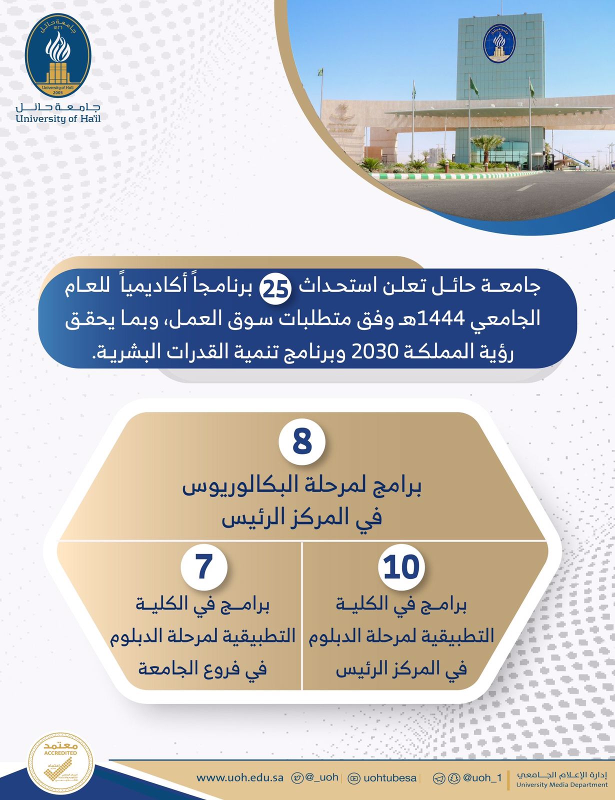 وأضاف أن الجامعة استحداث ٢٥ برنامجاً أكاديميًّا، لمرحلتي البكالوريوس والدبلوم في الكلية التطبيقية، والتي بدورها سوف تسهم في تهيئة الطلبة لسوق العمل، وبما يحقق رؤية المملكة ٢٠٣٠، وبرنامج تنمية القدرات البشرية.