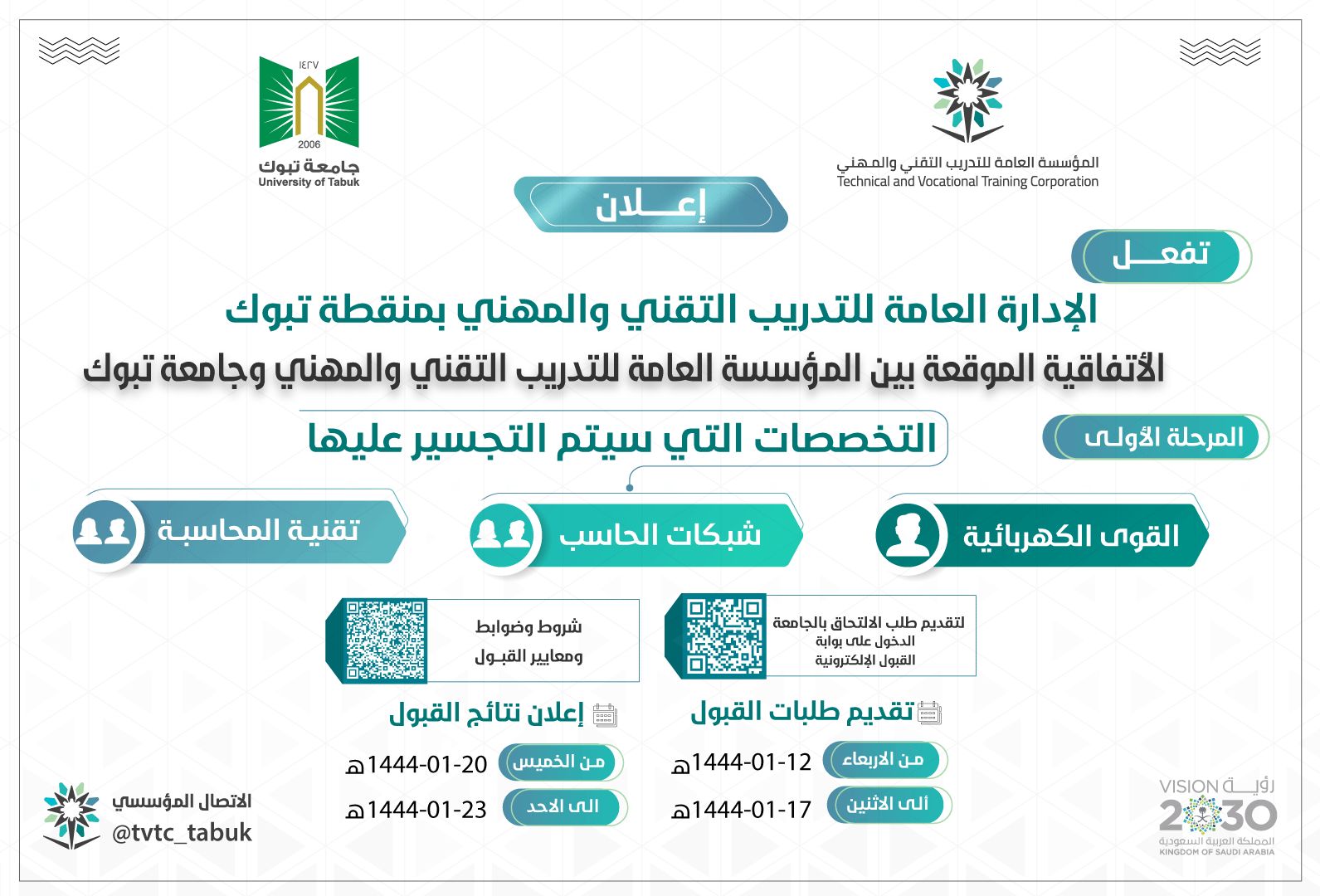 إعتمدت جامعة تبوك فتح باب القبول والتسجيل في 3 تخصصات لـ 3 أقسام مختلفة لخريجي وخريجات درجة الدبلوم للكليات التقنية لعام 1444 هـ .