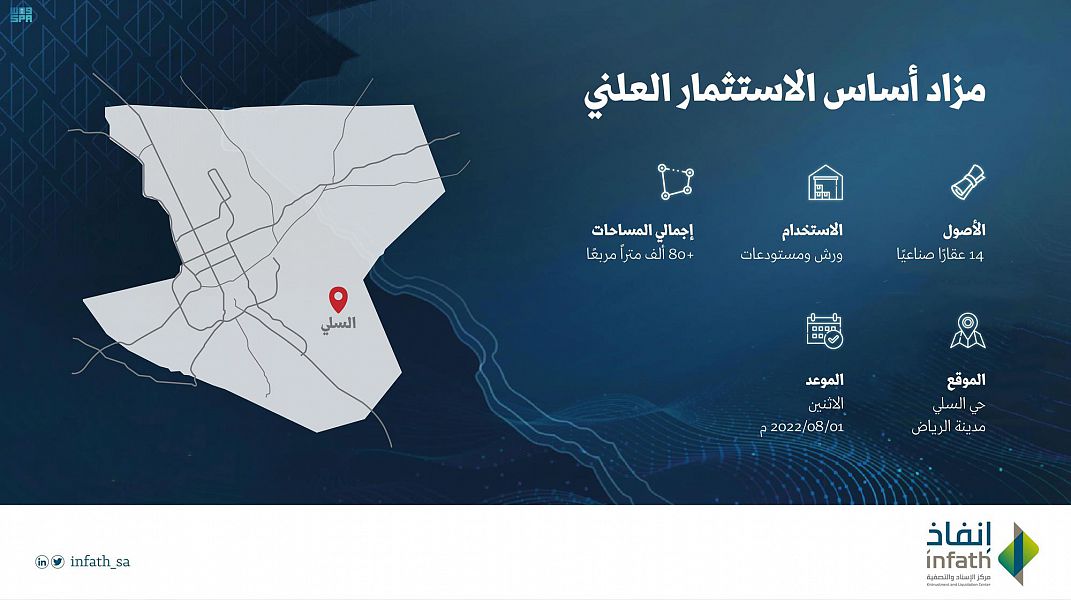 وتعرض المزادات 14 أصلًا عقاريًا صناعيًا في شرق مدينة الرياض بمساحات إجمالية كبرى، تقدّر بأكثر من 80 ألف متر مربع، وتتمثل العقارات في 3 أراضٍ صناعية بحي السلي مرخصة لإقامة ورش صناعية، و 11 أرضًا مرخصة لإقامة مستودعات، ولمعرفة تفاصيل المزاد وشروط المشاركة يمكن الاطلاع على صفحة المزادات ببوابة المركز من خلال الرابط: infath.sa/auctions .
