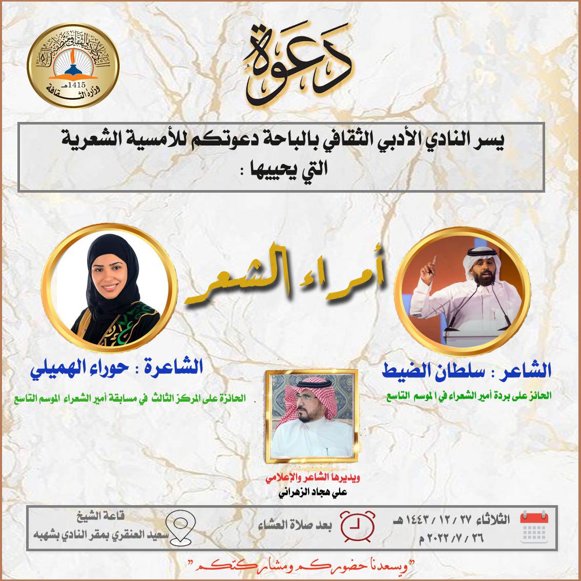 وسيدير الأمسية الإعلامي والشاعر علي هجاد الزهراني