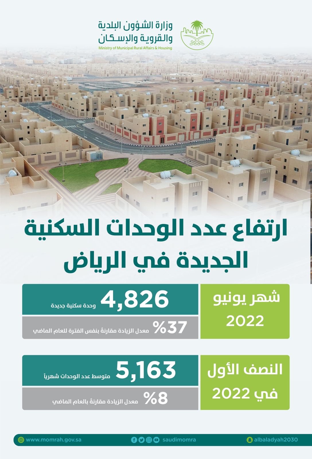 كشف تقرير صادر عن مركز ذكاء الأعمال ودعم القرار بوزارة الشؤون البلدية والقروية والإسكان يتعلق بمؤشر نهاية البناء للمعروض السكني الجديد، أن عدد الوحدات السكنية الجديدة بمدينة الرياض لشهر يونيو من هذا العام بلغ 4826 وحدة سكنية، مرتفعاً بما نسبته 37% عن نفس الفترة من العام الماضي.