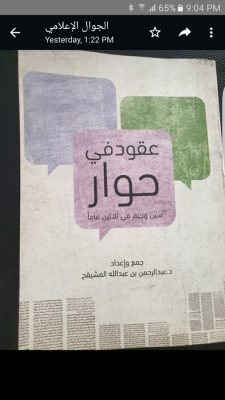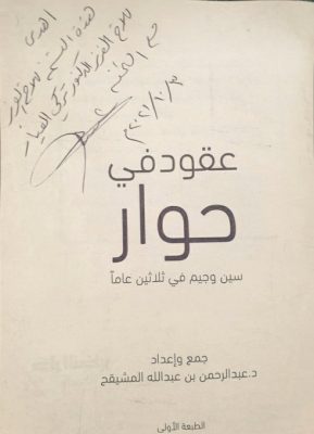 أهدي د.عبدالرحمن عبدالله المشيقح الذي يعد من ابرز رجال الاعمال والمثقفين السعوديين بالقصيم الي د.تركي فهد العيار ملحق ثقافي في كورياوالبحرين سابقا أستاذ جامعي ومستشار إعلامي في الدراسات الاستراتيجية ومدرب صحافة وعلاقات عامة وعضو منتدى الخبرة السعودي نسخه من احد اهم اعمالة  بعنوان(عقود في حوار) .
