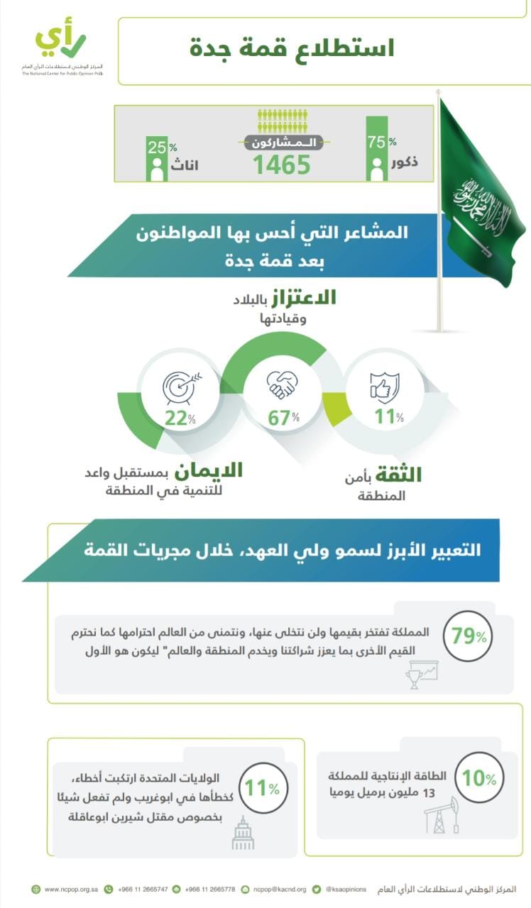 وقد جاءت نتائج الاستطلاع على النحو التالي: حول المشاعر التي أحس بها المواطنون بعد قمة جدة، قال 67% من العينة أنهم يشعرون بالاعتزاز بالبلاد وقيادتها، فيما عبر 11% عن شعورهم بالثقة بأمن المنطقة، و22 يشعرون بالإيمان بمستقبل واعد للتنمية في المنطقة.