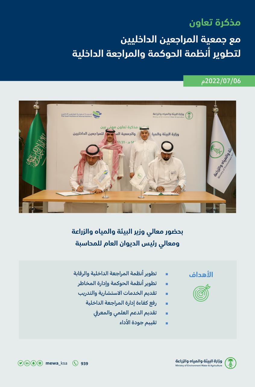 وقّعت وزارة البيئة والمياه والزراعة، اليوم، مذكّرة تعاون مع الجمعية السعودية للمراجعين الداخليين، لتطوير أنظمة المراجعة الداخلية والحوكمة والرقابة، وتقديم الخدمات الاستشارية والتدريب، وذلك بحضور معالي وزير البيئة والمياه والزراعة المهندس عبد الرحمن بن عبد المحسن الفضلي، ومعالي رئيس الديوان العام للمحاسبة رئيس مجلس إدارة الجمعية الدكتور حسام بن عبد المحسن العنقري.