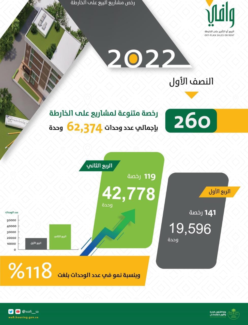 أصدرت الأمانة العامة للجنة البيع أو التأجير على الخارطة (وافي) 260 رخصة متنوعة لمشاريع البيع والتأجير والتسويق على الخارطة خلال النصف الأول من العام 2022، بإجمالي وحدات بلغ 62374 وحدة عقارية؛ وذلك استمراراً لدور “وافي” في تنظيم سوق البيع والتأجير على الخارطة ورفع مستوى الشفافية فيه ودعم الاستثمار؛ لتعزيز المعروض العقاري من الأراضي والوحدات السكنية وفقاً لمستهدفات برنامج الإسكان -أحد برامج رؤية المملكة 2030-؛ لزيادة نسبة التملك السكني للأسر السعودية إلى 70%.