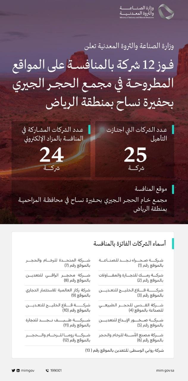 وبينت الوزارة أن الشركات الفائزة هي: شركة صحراء نجد للصناعة بالموقع رقم (1)، وشركة رمك للتجارة والمقاولات بالموقع رقم (2)، وشركة قلاع الخليج للتعدين بالموقع رقم (3)، وشركة القدس للحجر الطبيعي للصناعة بالموقع (4)، وشركة صخور الإبداع للتعدين بالموقع رقم (5)، وشركة مصنع الأسنة للرخام والحجر بالموقع رقم (6)، وشركة المتحدة للرخام والحجر بالموقع رقم (7)، وشركة محجر الراقي للتعدين بالموقع رقم (8)، وشركة ركاز العالمية للاستثمار التجاري بالموقع (9)، وشركة قلاع الخليج للتعدين بالموقع رقم (10)، وشركة طيف نجد للتجارة بالموقع رقم (11)، وشركة روما للرخام والحجر بالموقع رقم (12)، وشركة روابي الوسطى للتعدين بالموقع رقم (13).