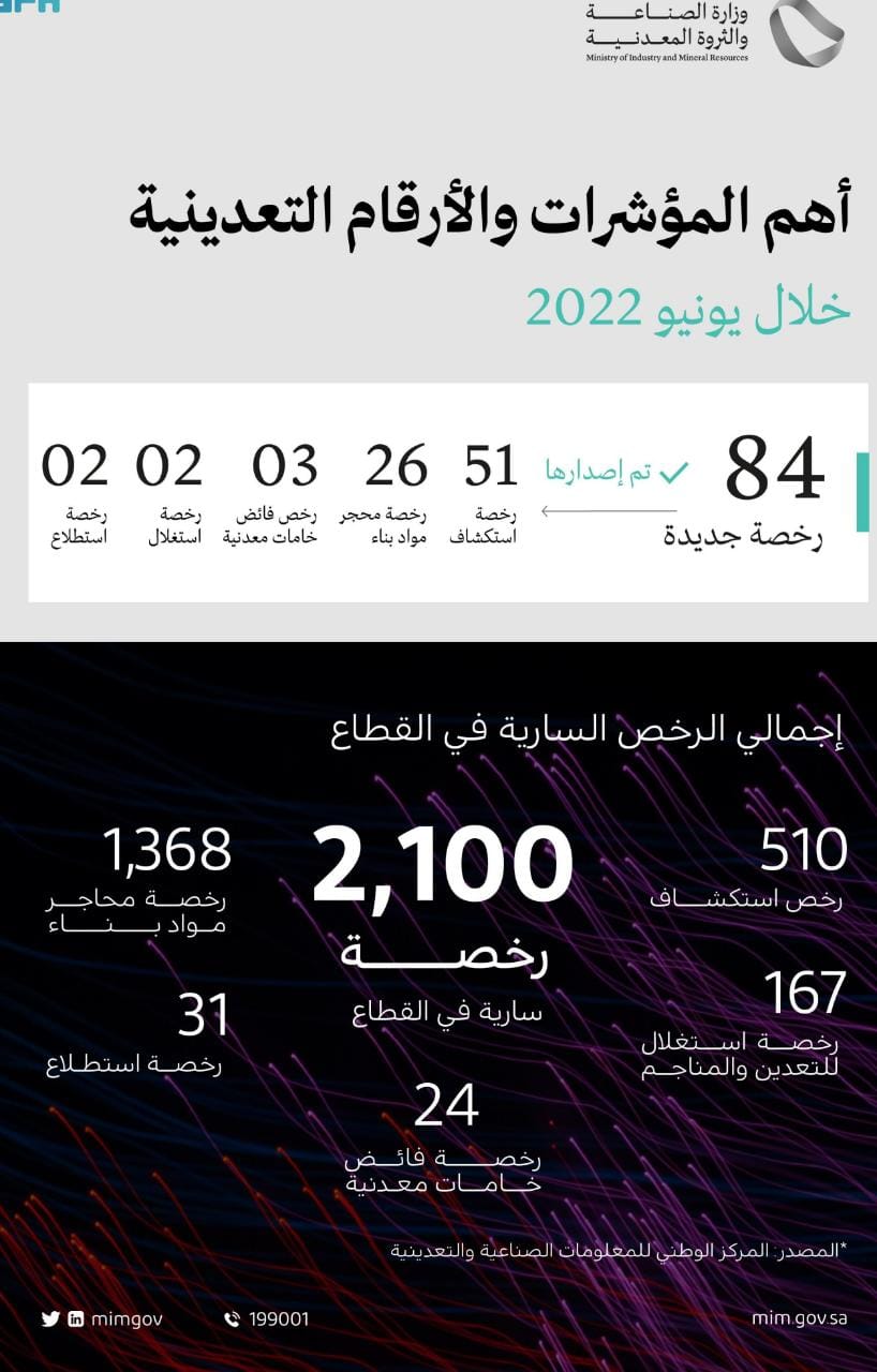 كشفت وزارة الصناعة والثروة المعدنية عن إصدار 84 رخصة تعدينية جديدة خلال شهر يونيو الماضي، تتمثل في 51 رخصة استكشاف، و 26 رخصة لمحاجر مواد البناء، و 3 رخص فائض خامات معدنية، ورخصتي استغلال، ورخصتي استطلاع، وذلك وفقًا لتقرير المركز الوطني للمعلومات الصناعية والتعدينية التابع للوزارة.