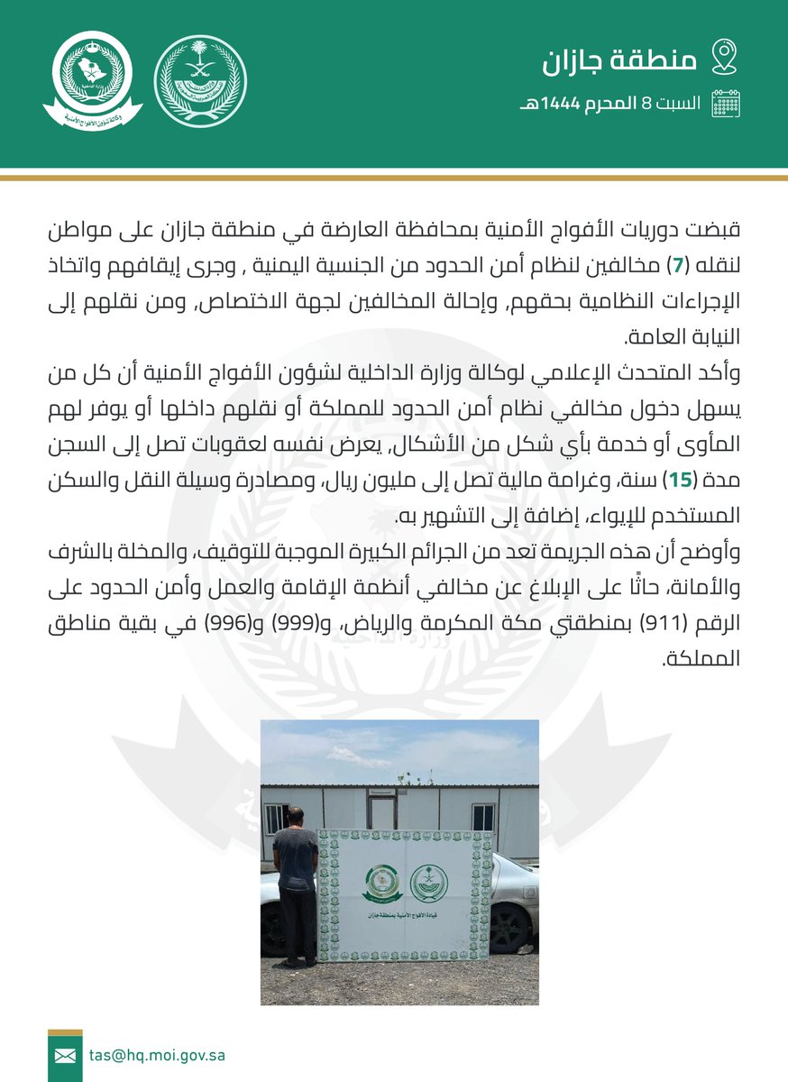 وأوضح أن هذه الجريمة تعد من الجرائم الكبيرة الموجبة للتوقيف، والمخلة بالشرف والأمانة، حاثًا على الإبلاغ عن مخالفي أنظمة الإقامة والعمل وأمن الحدود على الرقم (911) بمنطقتي مكة المكرمة والرياض، و(999) و(996) في بقية مناطق المملكة.