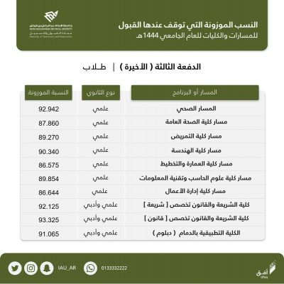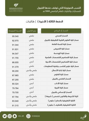 أعلنت جامعة الإمام عبد الرحمن بن فيصل ممثلة بعمادة القبول والتسجيل عن الدفعة الثالثة من الطلاب والطالبات المرشحين والمرشحات للقبول في مسارات السنة التحضيرية والبرامج الأخرى للعام الجامعي 1444هـ لتغطية كافة مقاعد القبول المتاحة والشاغرة.