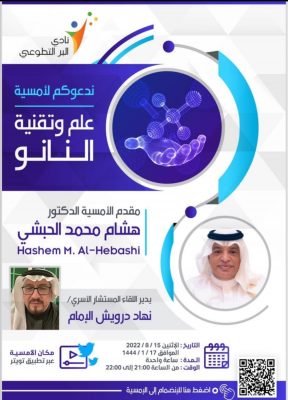 يقيم نادي البر التطوعي التابع لجمعية البر بجدة مساء اليوم الاثنين لقاء تثقيفياً تحت عنوان: “علم وتقنية النانو”، يستضيف من خلاله الدكتور هاشم محمد الحبشي أحد رواد تقنية النانو الذي يلقي الضوء على تكنولوجيا هذا العلم (تقنية الجزيئات متناهية الصغر) واستخداماته المعاصرة لما يمثله من ثورة تقنية في مختلف المجالات العلمية والطبية والهندسية.