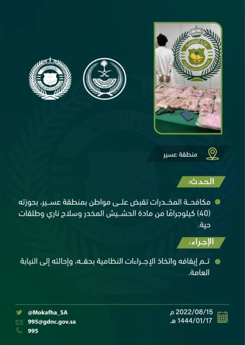 قبضت المديرية العامة لمكافحة المخدرات على مواطن بمنطقة عسير، بحوزته (40) كيلوجراماً من مادة الحشيش المخدر، وسلاح ناري وطلقات حية، وجرى إيقافه واتخاذ الإجراءات النظامية بحقه، وإحالته إلى النيابة العامة.