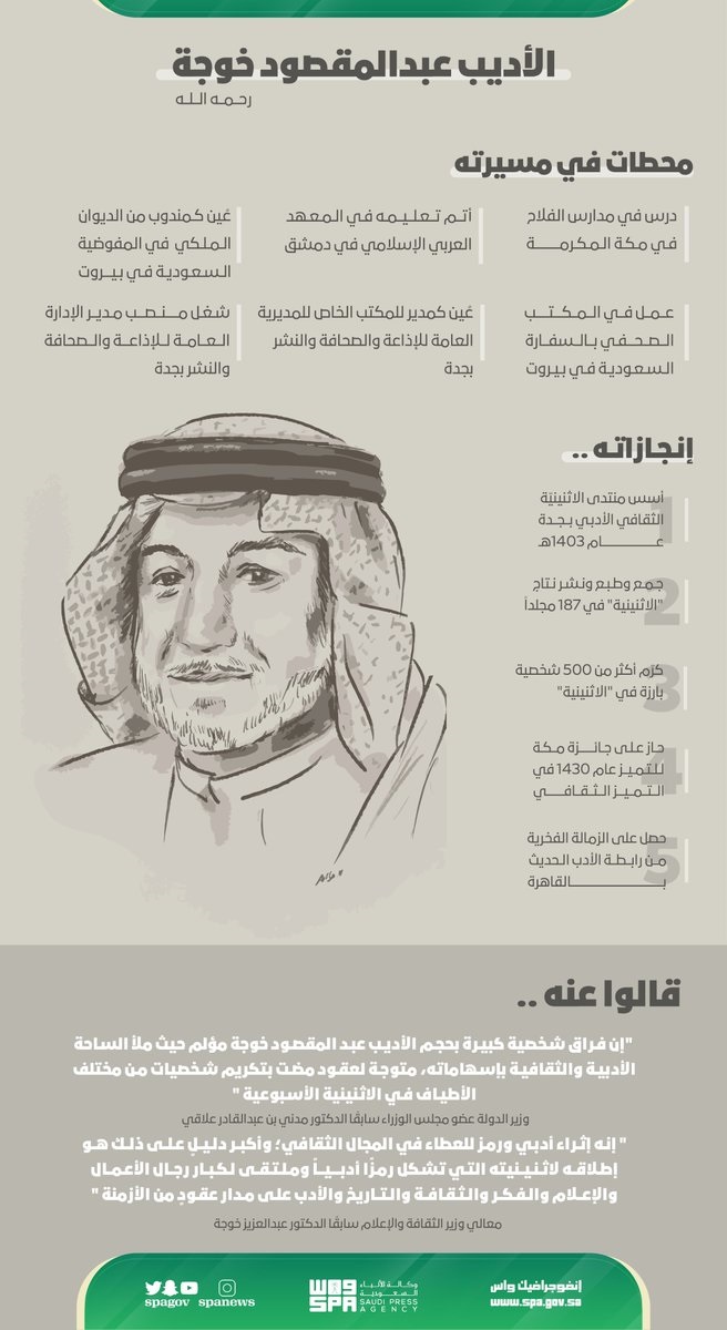 وأشار معاليه إلى أن الأديب الراحل كان عنواناً للرجل الداعم للعمل الثقافي؛ وهذا امتداد لوالده محمد سعيد عبدالمقصود خوجه؛ الذي يعد أحد رؤساء تحرير جريدة أم القرى؛ فتجده داعماً للحراك الثقافي والأدبي ومشاركاً في مختلف الفعاليات، واستضافة النخب الثقافية والفكرية في داره؛ لحرصه على مد جسور التواصل مع رجالات الثقافة والأدب، وإيجاد مساحة للمناقشة والتحاور خدمة للحركة الثقافية بشكل عام.