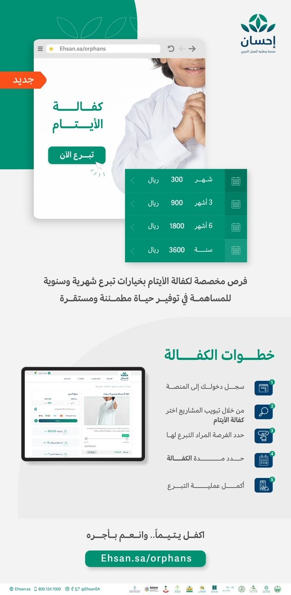 أطلقت المنصة الوطنية للعمل الخيري (إحسان) خدمة كفالة الأيتام على موقع وتطبيق المنصة؛ لعرض فرص تبرع مخصصة تمكّن المتبرعين من تقديم الدعم المادي للأيتام، والمساهمة في مساندتهم وتوفير كافة احتياجاتهم وتأمين حياة مستقرة لهم، بما يفعّل المسؤولية الاجتماعية في مجال كفالة الأيتام الذي يُعد من أفضل أبواب الرزق والثواب.