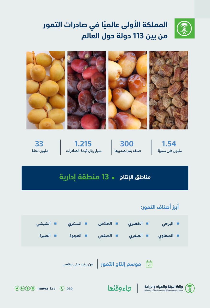 وأكد تقرير صادر من الوزارة ضمن حملة “جاء وقتها” التي تستهدف نشر المعرفة بالمنتجات الزراعية، وزيادة التوعية بالخيارات المتنوعة للفواكه الموسمية ورفع كفاءة منظومة تسويق الفواكه المحلية لدعم المزارعين المحليين وزيادة نسبة عوائدهم المالية، أن موسم إنتاج التمور يبدأ من يونيو حتى نوفمبر في مختلف المناطق، حيث تتميز المملكة بإنتاج أجود أنواع التمور، وتعمل الوزارة على أن تصبح المملكة المصدر الأكبر للتمور على مستوى العالم، وذلك عبر ترويج علامة التمور السعودية من خلال تحسين جودة الإنتاج في المزارع بإتباع الممارسات الزراعية الجيدة، واعتماد معايير الجودة للتمور القابلة للتصدير في المصانع ومحطات التعبئة، كما أسهمت المزارع العضوية وتطبيق معايير الهيئات الغذائية الدولية لتسهيل عملية التصدير وزيادة الطلب في الأسواق الخارجية للتمور كمنتج عضوي مرخص في أوروبا وأمريكا واليابان، مما ساهم في تشجيع الاستثمار لتطوير واستدامة قطاع النخيل والتمور لتكون تمور المملكة الخيار الأول عالميًا.