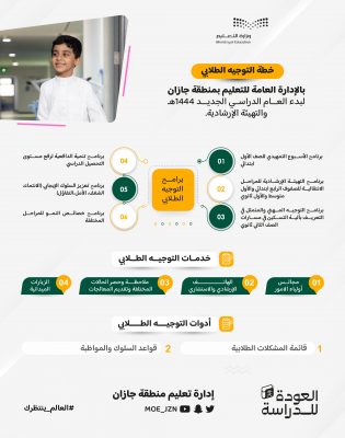 تنفذ الإدارة العام للتعليم بمنطقة جازان مع انطلاقة العام الدراسي الجديد 1444هـ 8 برامج توجيهية لتقديم التهيئة النفسية لطلابها وطالباتها في مختلف المراحل التعليمية، بما يضمن تقديم الدعم المناسب لهم ولأسرهم من الناحية النفسية والاجتماعية والتربوية، وذلك ضمن خطط استعدادها لانطلاقة العام الدراسي الجديد 1444هـ.