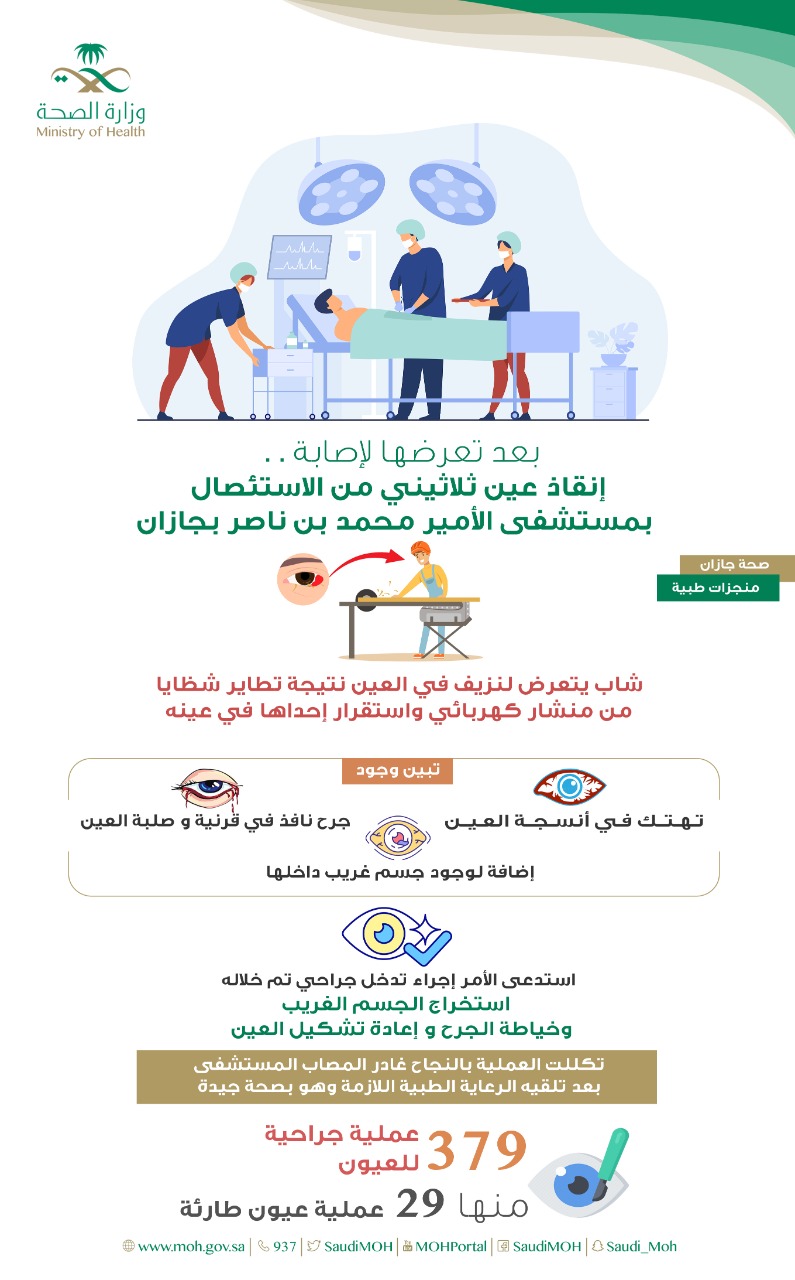 قالت صحة جازان أن فريقاً طبيًّا بمستشفى الأمير محمد بن ناصر، تمكن من إنقاذ عين ثلاثيني بعد تعرضها للإصابة ولله الحمد.