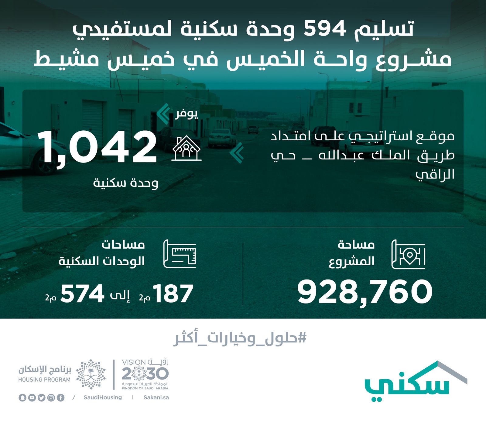 واصل برنامج سكني تسليم الأسر السعودية المستفيدة وحداتهم السكنية في المشاريع التي يتم تنفيذها بالشراكة مع المطورين العقاريين، حيث أنهى البرنامج تسليم 594 وحدة سكنية لمستفيدي مشروع واحة الخميس الذي تحتضنه محافظة خميس مشيط بمنطقة عسير، ويأتي ذلك نتيجة للشراكة الفاعلة مع القطاع الخاص عبر برنامج شراكات الذي يهدف إلى توفير حلول ومنتجات سكنية متنوعة تتوافق مع احتياجات المواطنين بأسعار تنافسية مدعومة، سعياً لتحقيق مستهدفات برنامج الإسكان – أحد برامج رؤية المملكة 2030 – برفع نسبة التملك إلى 70% بحلول 2030.