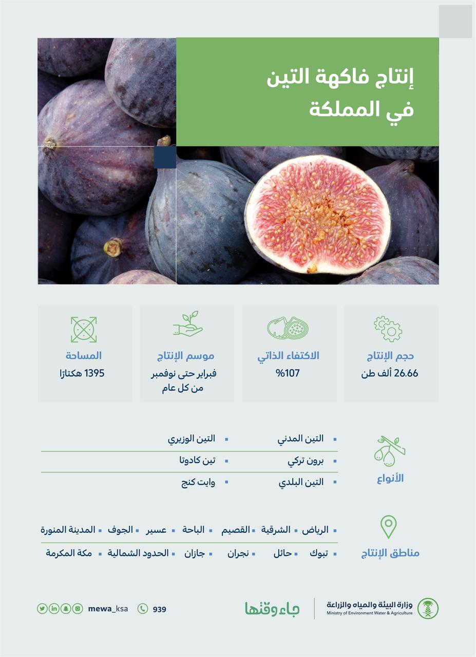وأكد تقرير صادر من الوزارة ضمن حملة “جاء وقتها”، التي تستهدف نشر المعرفة بالمنتجات الزراعية، وزيادة التوعية بالخيارات المتنوعة للفواكه الموسمية ورفع كفاءة منظومة تسويق الفواكه المحلية لدعم المزارعين المحليين وزيادة نسبة عوائدهم المالية، أن موسم إنتاج فاكهة التين يبدأ من فبراير حتى نوفمبر من كل عام، وتعتبر من المحاصيل الواعدة التي يتم إنتاجها بكميات متفاوتة في مناطق الرياض والشرقية والقصيم والباحة وعسير والجوف والمدينة المنورة وتبوك وحائل ومكة المكرمة ونجران وجيزان والحدود الشمالية.
