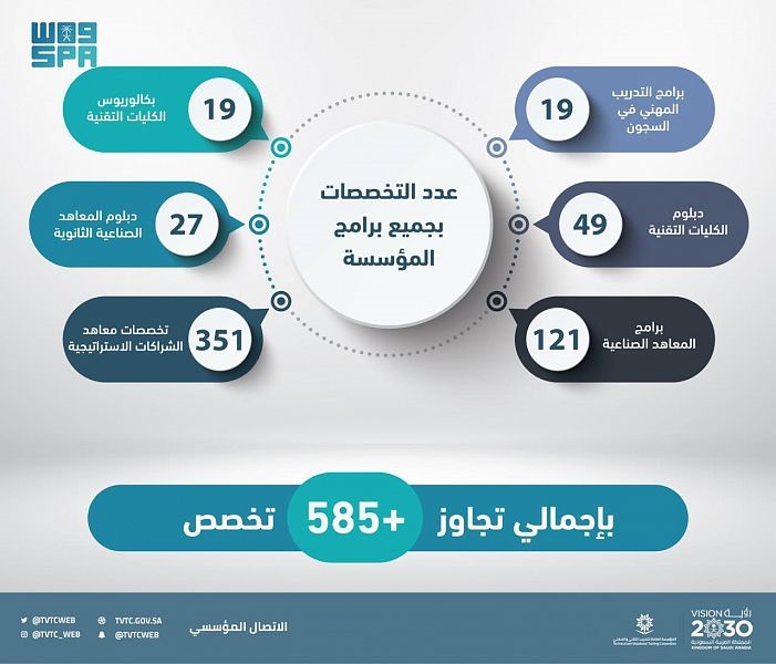 الجدير بالذكر أن عدد تخصصات المؤسسة في جميع برامجها قد تجاوزت 585 تخصصًا في كلياتها التقنية والعالمية والمعاهد الثانوية الصناعية ومعاهد التدريب في السجون وفي معاهد وأكاديميات الشراكات الاستراتيجية.