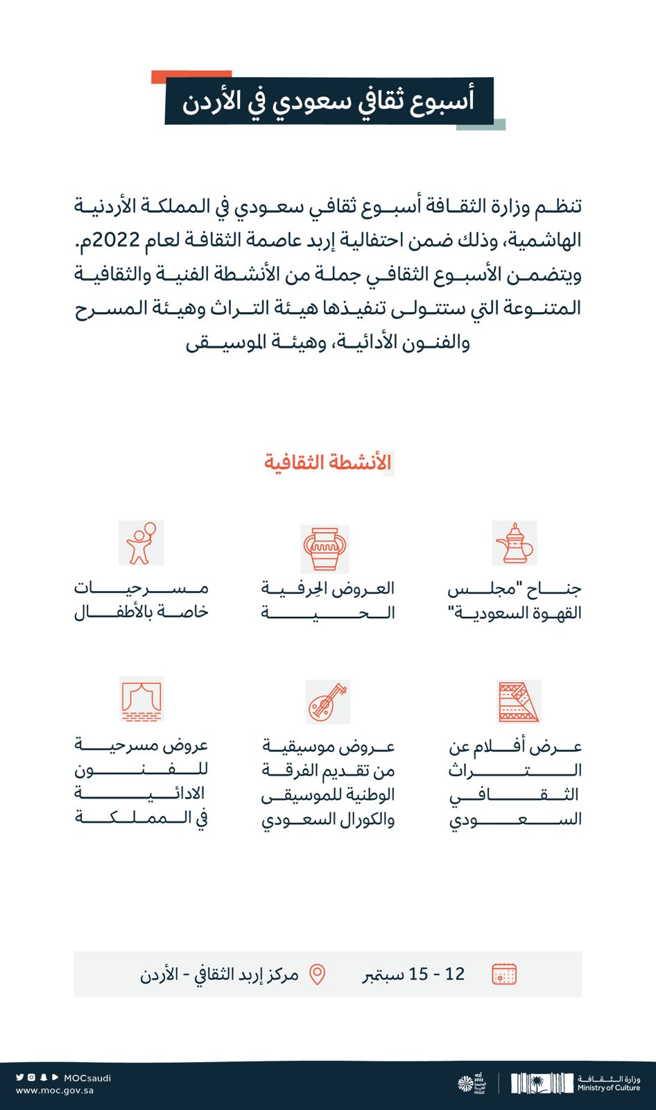 تنظم وزارة الثقافة أسبوعاً ثقافياً سعودياً في المملكة الأردنية الهاشمية خلال الفترة من (12- 15 سبتمبر الجاري)، وذلك ضمن احتفالية “إربد” عاصمة الثقافة لعام 2022م.