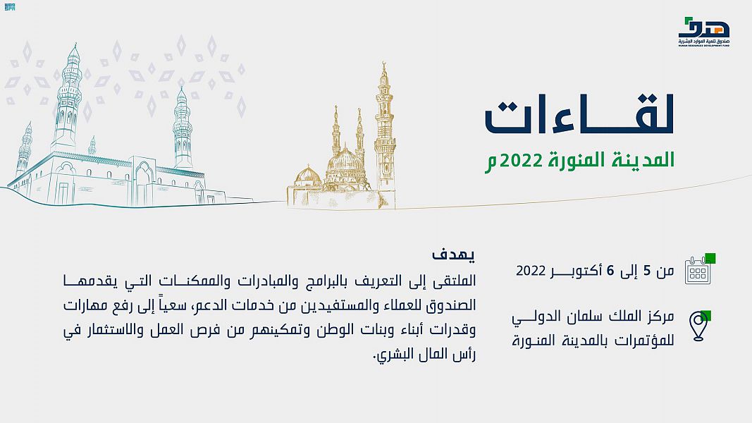 يعقد صندوق تنمية الموارد البشرية “هدف” في مركز الملك سلمان الدولي للمؤتمرات بالمدينة المنورة، ملتقى لقاءات “هدف” خلال الفترة 5 – 6 أكتوبر المقبل لدعم تدريب وتوظيف وتأهيل الكوادر الوطنية للالتحاق في سوق العمل.