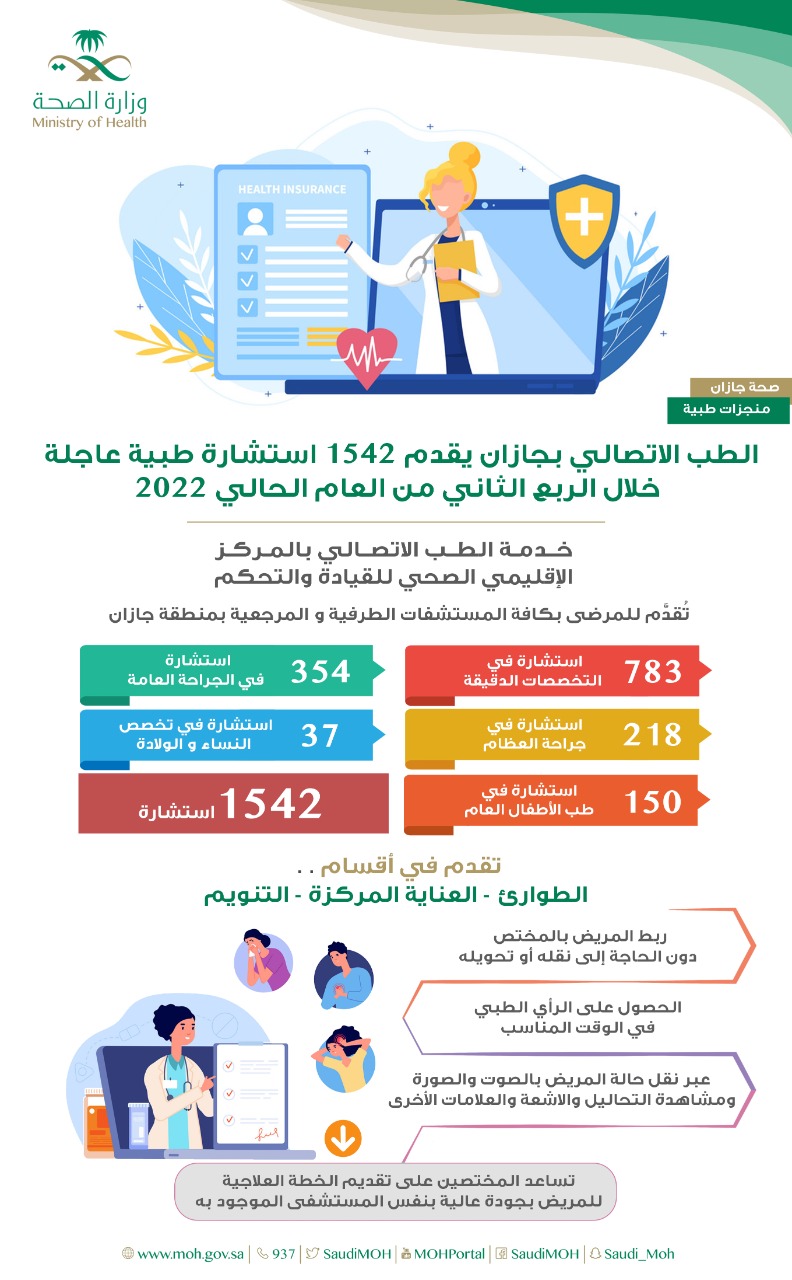 قالت صحة جازان أن خدمة الطب الاتصالي بالمركز الإقليمي الصحي للقيادة والتحكم قدمت 1542 استشارة طبية عاجلة وطارئة في مختلف التخصصات الطبية للمرضى بكافة المستشفيات الطرفية والمرجعية خلال الربع الثاني من العام الحالي 2022م.