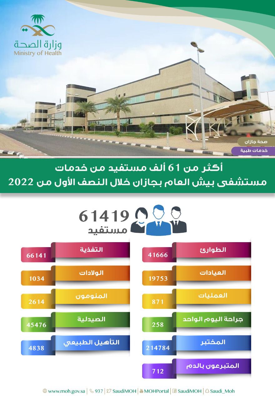 قالت صحة جازان أن مستشفى بيش العام قدم خدماته لـ 61419 ألف مستفيد ومستفيدة خلال النصف الأول من العام الحالي 2022م.
