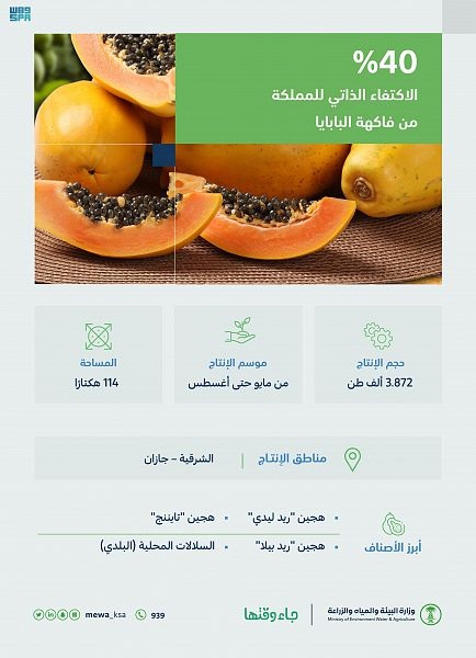 أخبار محلية > “البيئة”: 40% الاكتفاء الذاتي للمملكة من فاكهة البابايا بإنتاج سنوي يتجاوز 3.8 ألف طن