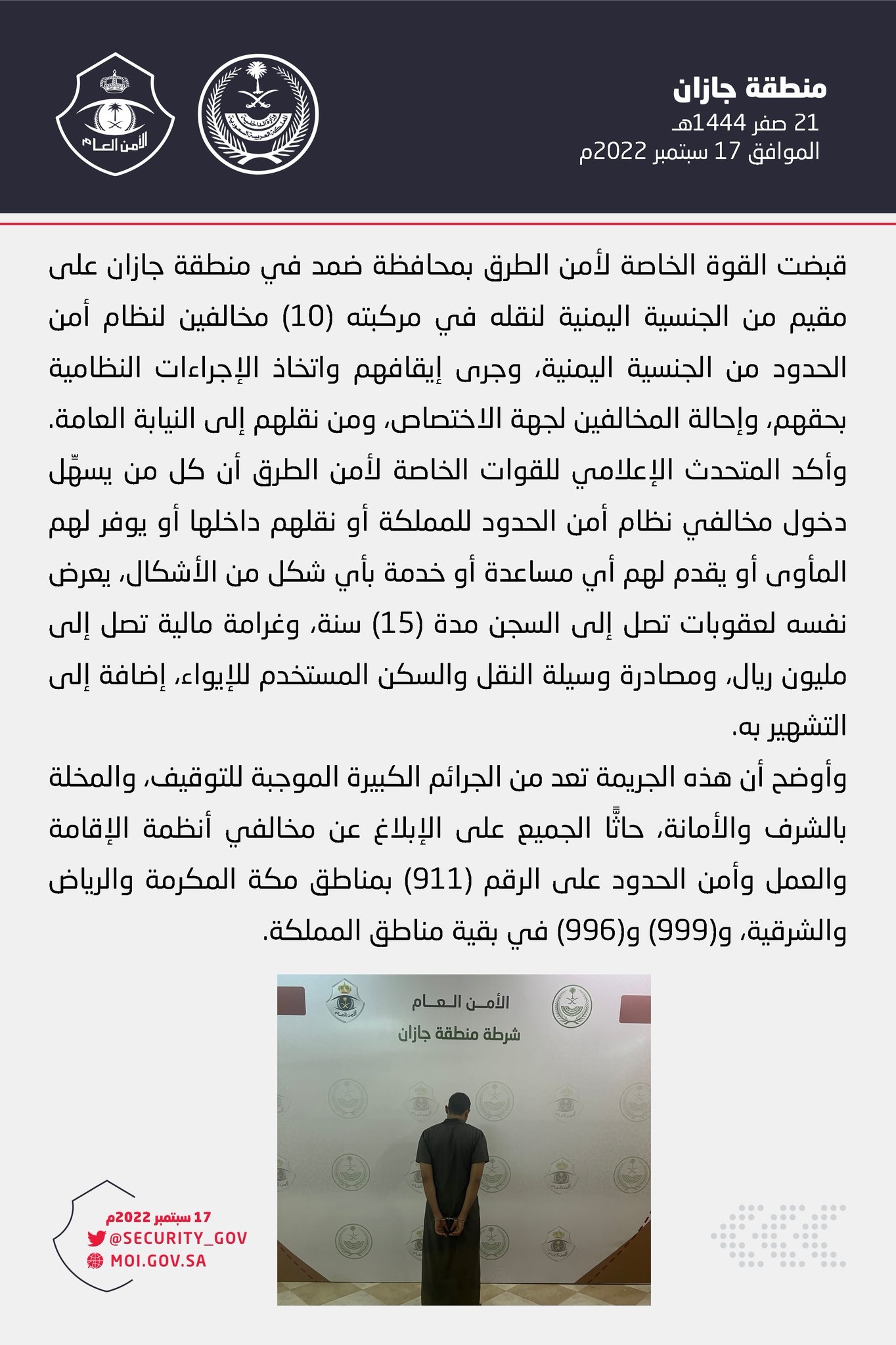 القوة الخاصة لأمن الطرق بمحافظة ضمد في منطقة جازان تقبض على مقيم لنقله في مركبته (10) مخالفين لنظام أمن الحدود