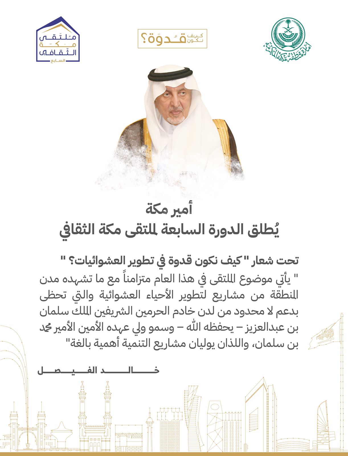 أعلن مستشار خادم الحرمين الشريفين أمير منطقة مكة المكرمة صاحب السمو الملكي الأمير خالد الفيصل إطلاق ملتقى مكة الثقافي في دورته السابعة تحت شعار ” كيف نكون قدوة في تطوير العشوائيات؟.