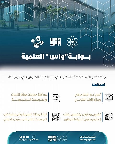 وخصصت “واس” هذه المنصة العلمية الأولى من نوعها على مستوى المملكة انطلاقاً من دورها الإعلامي المؤثر على المستويين المحلي والدولي في وقتٍ تخطو فيه نحو مواءمة مخرجاتها مع التطورات التي تشهدها المملكة على مختلف الصعد سياسياً واقتصادياً وثقافياً واجتماعياً ورياضياً، والتوسع في محتوى رسائلها الإخبارية وفق إستراتيجية تطويرية عمدت إلى إدراج عدد من التخصصات الحيوية ضمن نطاق تغطياتها ومنها الجانب العلمي الذي تتقاسم مجالاته العديد من المؤسسات الأكاديمية والمراكز المتخصصة في المملكة بهدف تسليط الضوء على الجهود القائمة ونتاج مخرجات البحث العلمي الذي يشكل عنصراً رئيساً في رؤية المملكة 2030 بغية التحوُّل إلى الاقتصاد المعرفي.