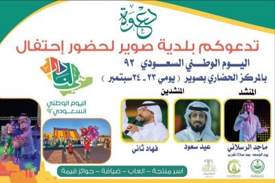 تحت شعار “هي لنا دار”، أنهت بلدية صوير كافة استعداداتها وتجهيزاتها للاحتفاء باليوم الوطني الـ92، والذي سوف يصادف يوم غدٍ الجمعة الموافق 23 سبتمبر، مشتملاً على عددٍ من الفعاليات الاجتماعية والثقافية والترفيهية المتنوعة.