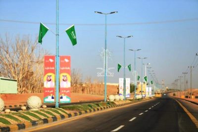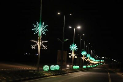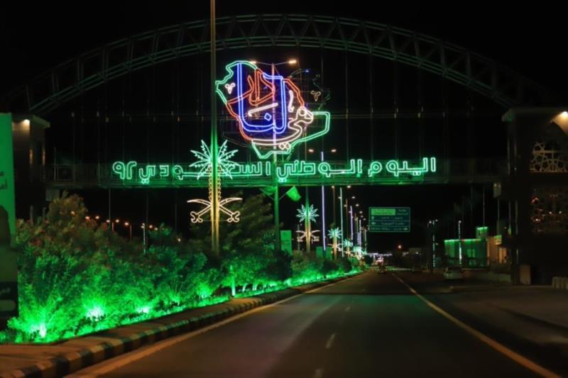 كما تزيّنت الشوارع والميادين بصور القيادة ، بالإضافة إلى اللوحات الوطنية والتي تعبر عن الولاء والانتماء للوطن وقيادته، مكتسية بالأعلام والإضاءة الخضراء، وتمّ تجهيز مقر الاحتفالات بمركز صوير الحضاري والذي سوف يحوي برامج منوعة على مدى يومين بحضور عددٍ من نجوم الإنشاد في المملكة.