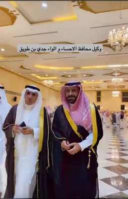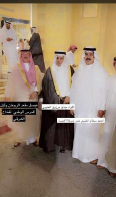 في ليلة من ليالي الأنس والفرح والسرور ليلة ارتسمت فيها ملامح الفرح بكافة ألوانه وكانت ليلة أحسائية احتفلت أسرة العتيبي بالاحساء بزواج ابنها الشاب النقيب – نايف بن المرحوم الرائد عبدالله بن مرزوق بن طويق العتيبي من منسوبي الشرطة العسكرية في مستشفي الملك عبدالعزيز بالأحساء بالحرس الوطني
