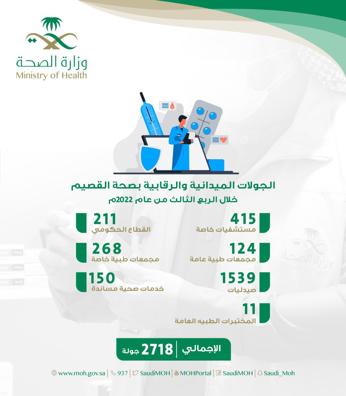 نفذت صحة القصيم (2718) جولة رقابية على المستشفيات والمراكز الحكومية والمجمعات الطبية والصيدليات خلال الربع الثالث للعام الحالي 2022م .