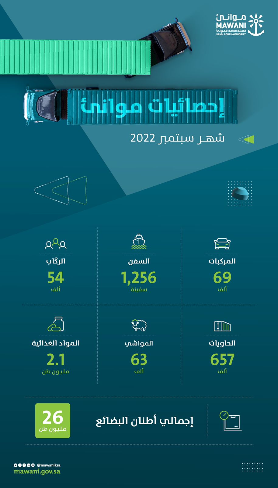 وفي سبيل تعزيز الأمن الغذائي وتلبية احتياجات السوق المحلية، بلغت أطنان المواد الغذائية 2,142,671 طن بزيادة 20.80% مقارنة بـ 1,773,668 طن في شهر سبتمبر لعام 2021م، وسجلت الماشية تفريغ 63,241 رأس ماشية، كما استقبلت الموانئ السعودية خلال شهر سبتمبر 2022م نحو 53,977 راكب.