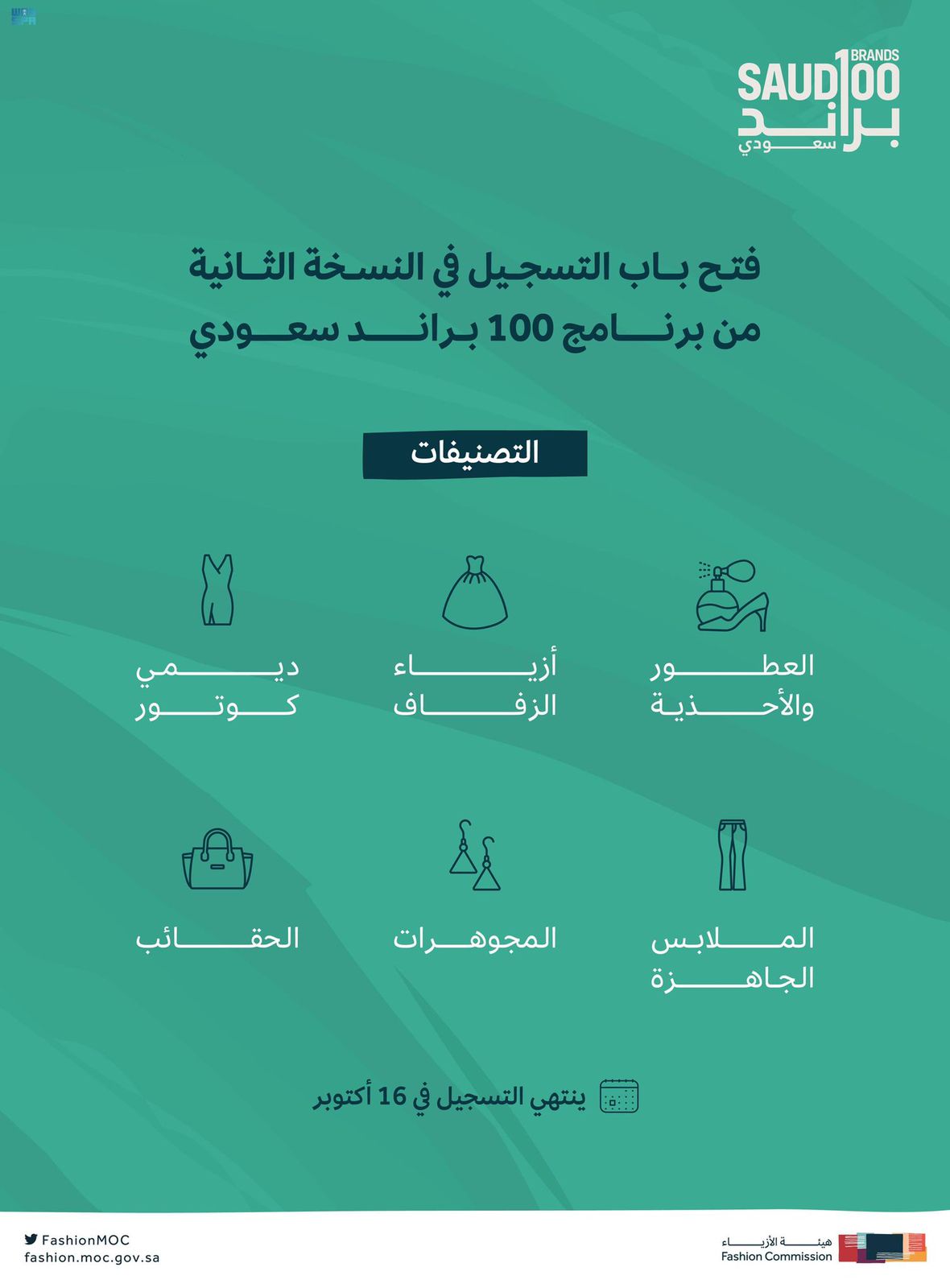ودعت الهيئة الراغبين في المشاركة بالبرنامج إلى التسجيل عن طريق الرابط الإلكتروني ( https://www.saudi100brands.com/ ) على أن يغلق باب التسجيل يوم الأحد 16 أكتوبر .