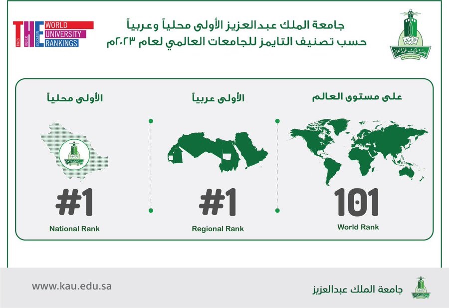 تحقيقاً لمستهدفات #رؤية_المملكة_2030 ودعم القيادة الرشيدة لقطاع الجامعات السعودية، حصلت #جامعة_الملك_عبدالعزيز على المرتبة 101 في تصنيف ” التايمز” للجامعات لعام 2023، مقارنة بالمركز 190 عالمياً في عام 2022