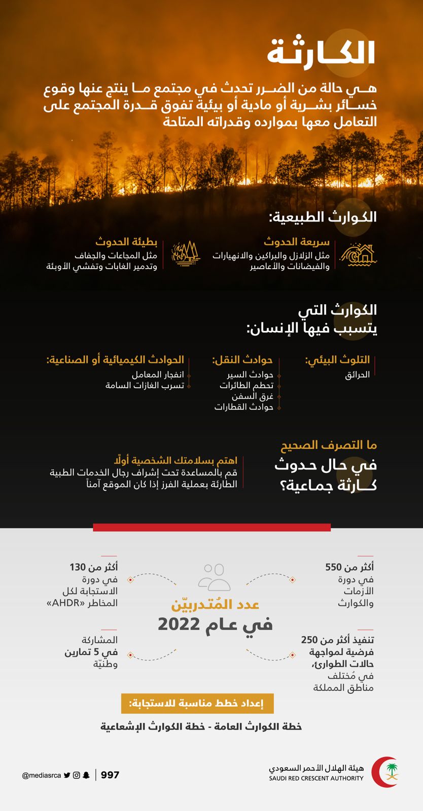 وأضاف أن خطط المملكة المتعلقة بالكوارث، تشمل خطة الكوارث العامة، إضافة إلى مجموعة من الخطط الفرعية، مثل خطة الكوارث الإشعاعية، وخطة الكوارث البيولوجية، وخطة الكوارث الكيميائية، بخلاف 20 خطة أخرى لضمان استمرار الأعمال حال اندلاع الكوارث -لا قدر الله- إضافة إلى المشاركة بمهام في الخطط الوطنية لمختلف انواع الكوارث و تشارك بها هيئة الهلال الأحمر السعودي وتعتبر من العناصر الرئيسية في تنفيذها.