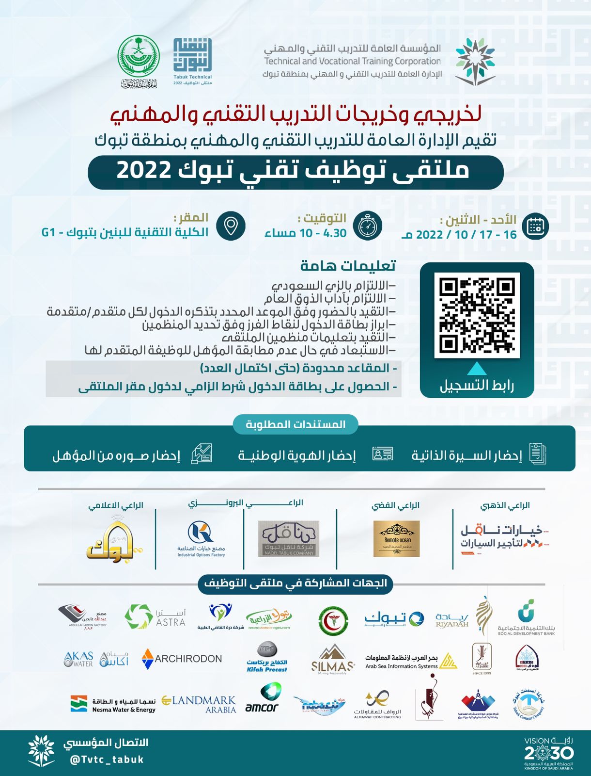 وأضاف أن الملتقى يهدف إلى الإسهام في توطين الوظائف وتأهيل القوى العاملة وإنشاء علاقة بين الكليات التقنية، والمعاهد الصناعية وقطاع الأعمال بمنطقة تبوك، داعياً الخريجين والخريجات للتقديم عبر المنصة الإلكترونية للملتقى من خلال الرابط : jobs.hugatech-dev.com .