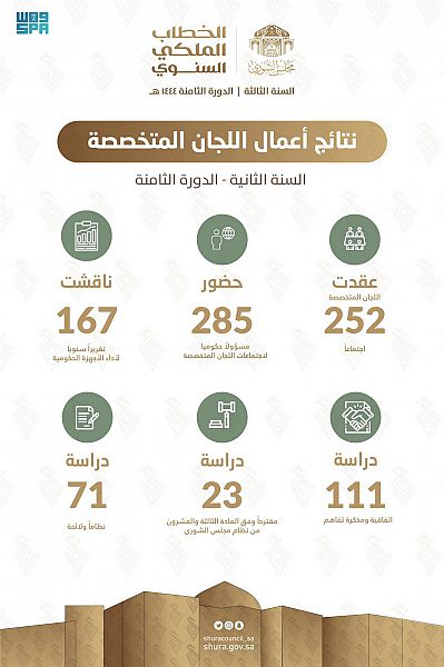 وقد درست لجان مجلس الشورى التي يبلغ عددها (خمس عشرة) لجنة منذ تشكيلها ضمن أعمال السنة الثانية للدورة الثامنة الحالية (372) موضوعاً منها (167) تقرير أداء سنوي، و(71) من مشاريع الأنظمة واللوائح، و(111) من مذكرات تفاهم واتفاقيات، وتمت هذه المناقشات خلال (252) اجتماعاً عقدتها هذه اللجان بمختلف اختصاصاتها طوال العام الشوري الماضي، بكل جد واجتهاد من قبل أعضائها، وحضر خلال هذه الاجتماعات التي عقدتها لجان المجلس المتخصصة (285) مندوباً من مسؤولي الجهات الحكومية الذين أجابوا على ما لدى اللجنة من استفسارات، بشأن ما تدرسه لجان المجلس من تقارير وأنظمة، وقدموا مرئياتهم حياله، تجسيدًا لأدوار المجلس الرقابية.