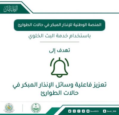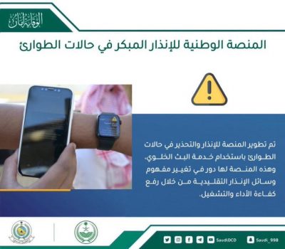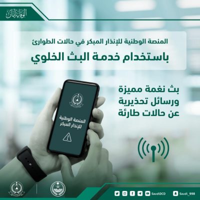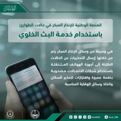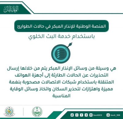 واوضحت المديرية العامة ان المنصة الوطنيه للإنذار المبكر في حالات الطوارئ تتم باستخدام تقنية البث الخلوي لتغير مفهوم وسائل الانذار التقليدية من خلال رفع كفاءة الآداء والتشغيل .