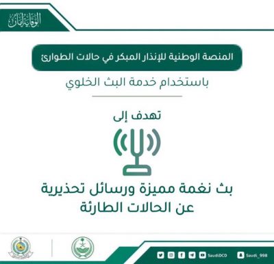 نشرت المديرية العامة للدفاع المدني عبر حسابها الرسمي في تويتر عدد من التغريدات والانفوجرافيك في الفترة الماضية عن المنصة الوطنية للإنذار المبكر في حالات الطوارئ , وهي وسيلة من وسائل الانذار في حالات الطواري يتم من خلالها ارسال رسائل تحذيرية عن الحالات الطارئة الى أجهزة الجوال المرتبطة بشبكات الجوال مصحوبة بنغمة مميزة عاليه واهتزازات لتحذير السكان واتخاذ الاجراء و التصرف المناسب .